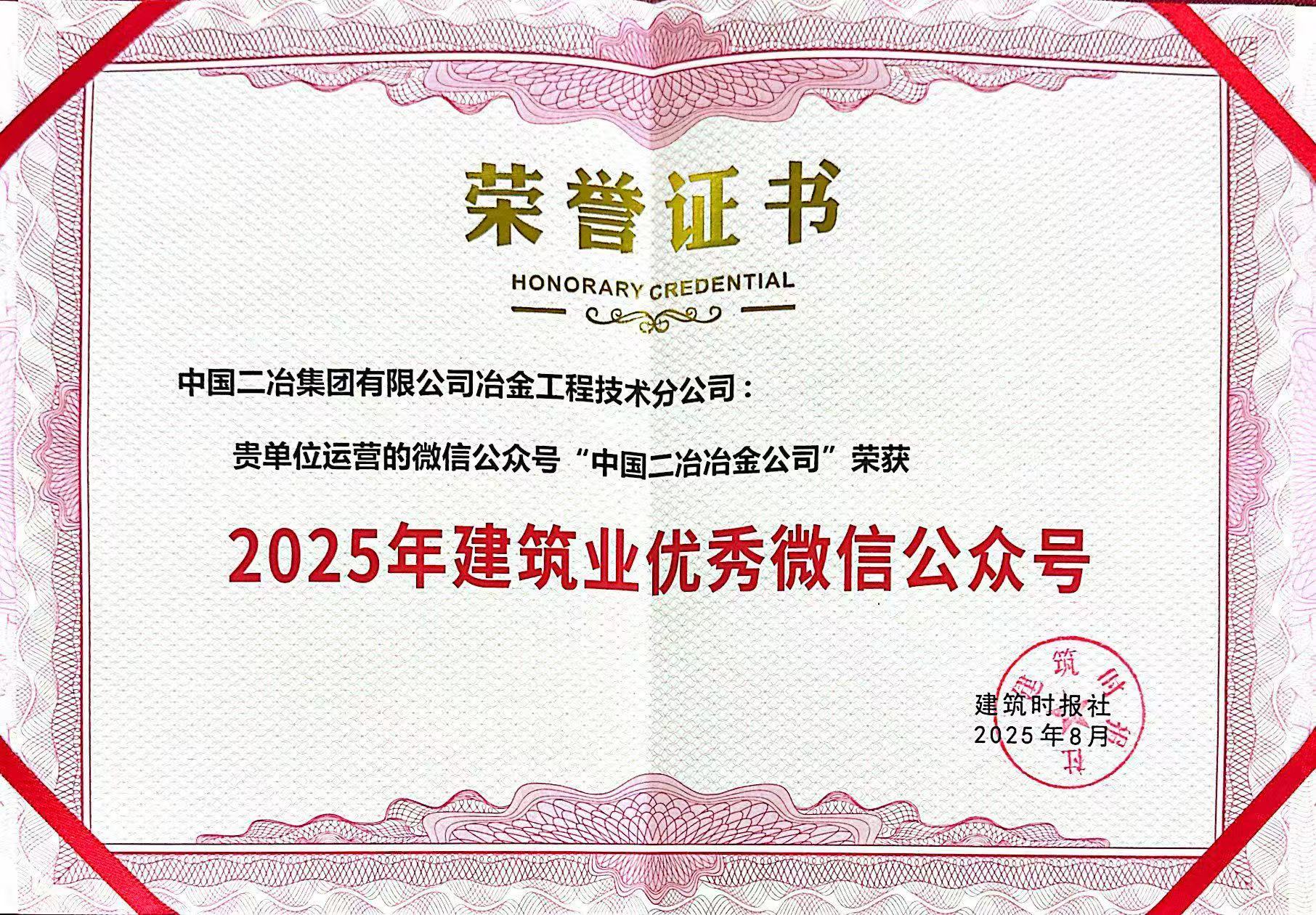 近日,中國二冶冶金分公司運(yùn)營的微信公眾號榮獲建筑時報社頒發(fā)的“2025年建筑業(yè)優(yōu)秀微信公眾號”稱號。這一榮譽(yù)不僅是對冶金分公司新媒體運(yùn)營工作的充分肯定,更是對中國二冶品牌影響力和企業(yè)文化傳播力的高度認(rèn)可。