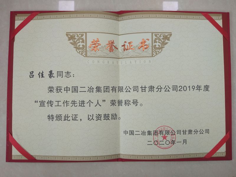 呂佳豪畢業(yè)于2015年蘭州文理學(xué)院(原甘肅聯(lián)合大學(xué))新聞采編專業(yè)。先后在國(guó)企甘肅路橋建設(shè)集團(tuán)萬(wàn)泰公司項(xiàng)目辦公室,山東華達(dá)建設(shè)集團(tuán)宣傳部工作。2018年加入中國(guó)二冶集團(tuán)甘肅分公司;2019年,榮獲中國(guó)二冶集團(tuán)甘肅分公司、中國(guó)二冶集團(tuán)宣傳工作先進(jìn)個(gè)人。短短的時(shí)間履歷卻寫滿了他在工作崗位上的不平凡。