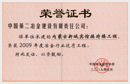 內(nèi)蒙古新城賓館接待樓獲冶金行業(yè)優(yōu)質(zhì)工程、中冶集團(tuán)優(yōu)質(zhì)工程、內(nèi)蒙古自治區(qū)優(yōu)質(zhì)樣板工程、內(nèi)蒙古自治區(qū)用戶滿意工程。