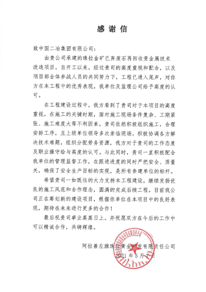 阿拉善左旗珠拉黃金開發(fā)有限責(zé)任公司在感謝信中指出,在工期緊、任務(wù)重的情況下,項目部在跟進(jìn)進(jìn)度的同時,嚴(yán)把安全質(zhì)量關(guān),確保了安全生產(chǎn)目標(biāo)的實現(xiàn),是所有參建單位中的標(biāo)桿。