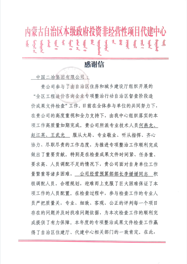 此次獲贈感謝信,是自治區主管部門對中國二冶專業能力與責任擔當的高度認可。作為深耕內蒙古的建筑央企,中國二冶將持續發揮專業優勢,堅守行業紅線底線,為規范工程造價市場、推動建筑業高質量發展貢獻央企力量。