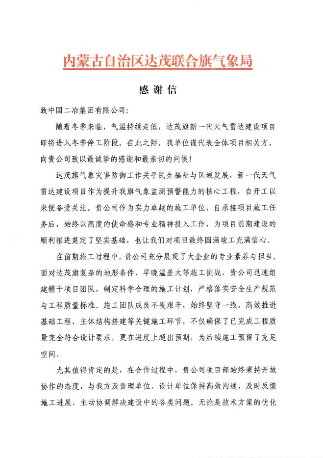 11 月 16 日,中國二冶收到內蒙古自治區達茂聯合旗氣象局發來的感謝信,信中對公司在達茂旗新一代天氣雷達建設項目施工中的專業表現與辛勤付出給予高度肯定,并致以誠摯感謝。