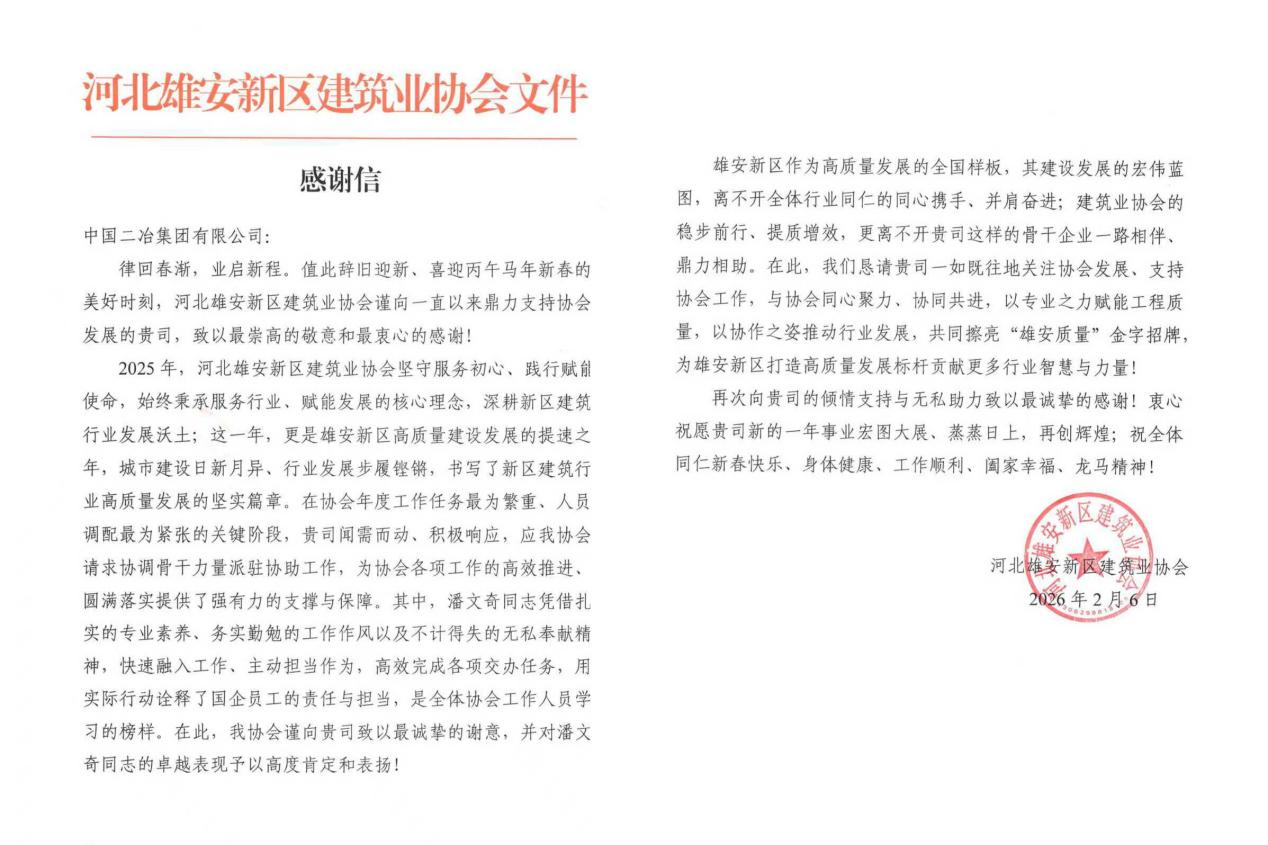 感謝信指出,中國二冶始終堅守初心、履職盡責,在項目建設中搶工期、保質量、守安全、促環保,不僅高效推進各項工程節點順利落地,更積極參與新區工程建設行業交流,主動分享建設經驗,助力提升區域建筑業整體發展水平,為雄安新區大規模建設與高質量發展注入了強勁動力,用實際行動生動詮釋了央企的責任與擔當。