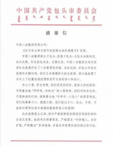 中國(guó)二冶收到包頭市委市政府感謝信